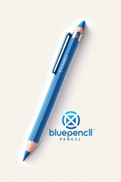 company logo, "blue_pencil" logo has a bright blue color with a sleek pencil at its center