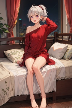 Full body, at night, in the bedroom, there is a (cute) girl sitting by the bed, with gray white hair, shoulder length ponytails, purple eyes, a small body shape, slim figure, white to red skin, upper body tilted backwards, hands open, arms open, legs together, smiling, cheeks slightly flushed, mouth slightly open, wearing a little devil dress and pajamas, without shoes on