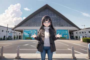best quality, ultra-detailed, illustration,sumasui, storefront, sky, outdoors, day, cloud, blue sky, sign, fence, scenery, poster (object),1girl, glasses, black hair, long hair, standing, duffel coat, pantyhose, jeans, smile, laughing, looking at viewer, solo focus, <lora:sumasui_SD15_V2:1>