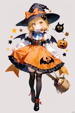bat, candy, ghost, halloween, halloween_bucket, halloween_costume, happy_halloween, jack-o'-lantern, pumpkin, pumpkin_hair_ornament, pumpkin_hat, trick_or_treat, witch_hat, manjuu_\(azur_lane\), candy_cane, emoji, holding_vegetable, star_\(symbol\), tombstone, lollipop, ghost_costume, hat, moon, silk, crescent_moon, spider_web, 1girl, long_hair, mini_witch_hat, graveyard, swirl_lollipop, orange_ribbon, lantern, vegetable, food, mimikyu, basket, grave, bat_hair_ornament, cookie, orange_bow, candy_wrapper, witch, vampire_costume, bat_wings, pennant, orange_bowtie, broom, hata_no_kokoro, bow, full_moon, chick, food-themed_hair_ornament, bat_print, basketball, bloomers, solo, luma_\(mario\), orange_dress, orange_legwear, blonde_hair, spider, yellow_eyes, spider_web_print, candle