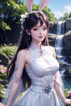 1girl,pink hair,animal ears,rabbit ears,waterfall,water,brown hair,dress,flower,smile,solo,upper body,white long lace clothes,