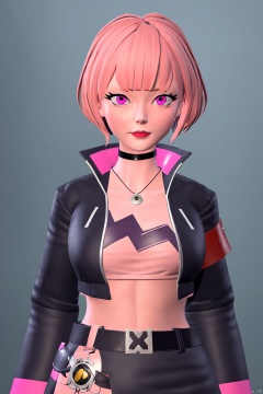 (shy),ZOE,1girl,jacket,black belt,black jacket,pink eyes,belt,choker,black choker,looking at viewer,crop top,jewelry,breasts,necklace,(short hair:1.2), masterpiece, best quality,