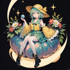 masterpiece, (illustration:1.2), (Cinematic Lighting), star, moon, bubble, fantastic, plant, best quality, 1girl, solo, hat, komeiji koishi, skirt, heart, shirt, thighhighs, green skirt, long sleeves, ribbon, looking at viewer, wide sleeves, third eye, frills, yellow shirt, hat ribbon, star (symbol), flower, green hair, black headwear, full body, short hair, blue eyes, blush, frilled sleeves, frilled shirt collar, gradient, green eyes, collarbone, frilled skirt, hat bow, yellow ribbon, bow, eyeball, floral print, yellow bow, blouse, parted lips, heart of string, bangs, open mouth, boots