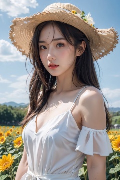 nai3, 1girl, flower, solo, dress, hat, sunflower, sky, outdoors, holding, long hair, cloud, holding flower, white dress, day, looking at viewer, green eyes, white headwear, blue sky, bangs, sun hat, virtual youtuber, petals, parted bangs, brown hair, contrail, bare shoulders, field, off shoulder, ribbon, blue ribbon, off-shoulder dress, flower field, yellow flower, sundress, cloudy sky, standing, collarbone, closed mouth, blush, sister cleaire, cowboy shot, chijian, Nebula