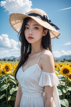 nai3, 1girl, flower, solo, dress, hat, sunflower, sky, outdoors, holding, long hair, cloud, holding flower, white dress, day, looking at viewer, green eyes, white headwear, blue sky, bangs, sun hat, virtual youtuber, petals, parted bangs, brown hair, contrail, bare shoulders, field, off shoulder, ribbon, blue ribbon, off-shoulder dress, flower field, yellow flower, sundress, cloudy sky, standing, collarbone, closed mouth, blush, sister cleaire, cowboy shot, chijian, Nebula