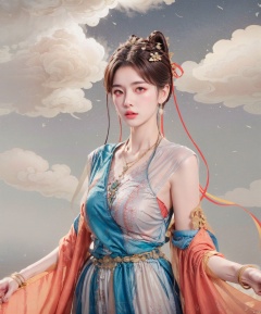 masterpiece, best quality, realistic, Highly detailed, (simple background),yue,1girl, solo, hair ornament, dress, jewelry, necklace, hair bun, bracelet, hanfu,brown hair, black hair, hair ornament, dress, jewelry, (upper body), necklace, hair bun, bracelet, chinese clothes,cloud background
