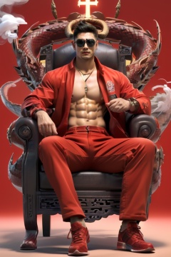 1boy,male focus,throne,black hair,jewelry,sunglasses,dragon,open clothes,sitting,abs,shoes,smoke,pants,box,necklace,jacket,red background,eastern dragon,horns,smoking,muscular,chair,cross,shirt,cigarette,pectorals,open shirt,cross necklace,red jacket,looking at viewer,<lora:龙女:0.8>,