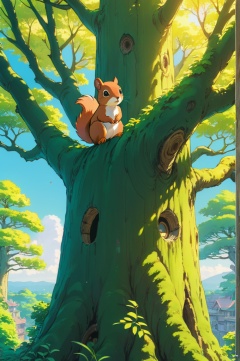 Squirrel Stick head out of a tree, Drill out, a tree, Anime, Soft color, studio ghibli, ghibli style, soft tone, panoramic, Ultra high saturation, bright and vivid colors, intricate, (best quality, masterpiece, Representative work, official art, Professional, 8k)