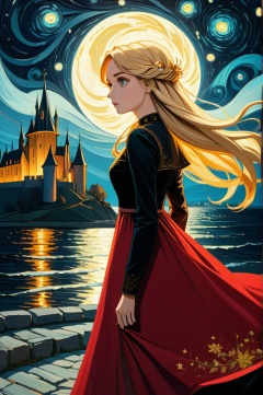Art by James R. Eads, Swirling and flowing lines to define, drawing inspiration from Van Gogh's Starry Night. 4K, ultra high definition picture quality, movie lighting effect, epic level, oil painting effect, cream texture, a girl, long straight hair color is red, colorful on her head, red and black dress, medieval style, castle, night, moonlight, night, clear facial features, beautiful face, beautiful face