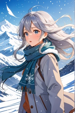 anime style of a girl, scarf, long silver flowing hair blowing in the wind, snow mountains in the far background, it's snowing