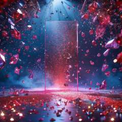 master piece, high quality, clean background booth, scattered ruby, very flash, crystal clear, emitting colorful light, star powder, center composition, split lighting, creative background design, front view, surreal scene, natural rendering, fantasy