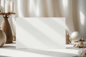 photorealistic,white blank paper on a table, with small luxurious decorations and boho tones decorative elements, soft daylight, bare tree, close up on the white notice invitation paper , shallow depth of field, minimalistic photogrpahy ,sunshine, light and shadow