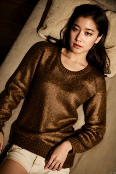 PHOTOREALISTIC REALISTIC, masterpiece, best quality, highres, ultra detailed, 8k,1woman,aoiyu,makeup,suit,sweater,lying,on back,cowboy shot,top down view,flash photography