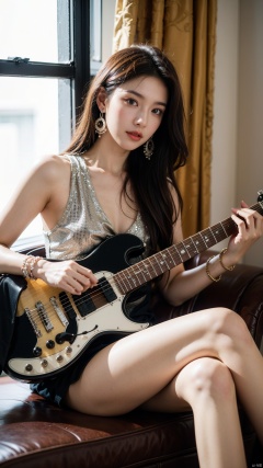 (8k, RAW photo, best quality, masterpiece:1.2),(realistic, photo-realistic:1.37),photon mapping,professional lighting,radiosity,1girl,solo,long_hair,(bracelet:1.1),(long legs:1.2),(earrings:1.1),physically-based rendering,proscenium,performance,be seated,unconventional guitar