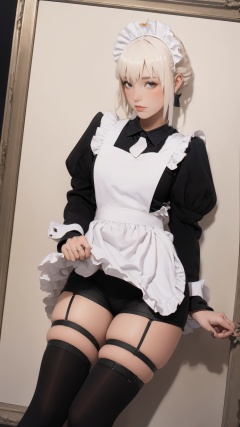 tutututu,apron,long sleeves,maid,maid apron,puffy sleeves,maid headdress,black shorts,black thighhighs,thigh strap,garter straps,<lora:tutututu_20240129122144-000005:0.85>,breathtaking detailed soft painting of the edge of the forest with ringing flowers od dream, a girl with a lip of mandarine with crossed knees in a light deluge, shadowed nudity through rainbow, flora and sea, rembrandt style, elegant, highly detailed, artstation, concept art, matte, sharp focus, art by tom bagshaw, luis royo and greg rutkowski,