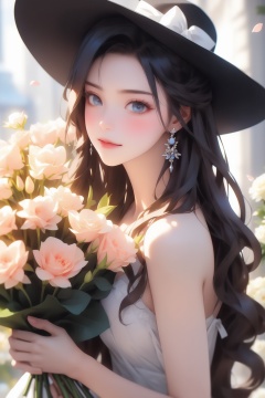 masterpiece,best quality,a woman with long hair holding a bouquet of flowers in her hands and wearing a hat with flowers on it,