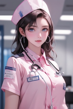masterpiece,best quality,a woman in a pink uniform with a stethoscope on her head and a stethoscope on her shoulder,