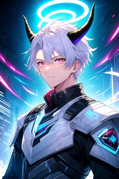 solo, looking at viewer, gloves, 1boy, closed mouth, jacket, upper body, white hair, male focus, horns, black gloves, glowing, halo, glowing eyes, zipper, white eyes, hair slicked back