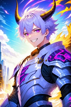 solo, looking at viewer, smile, short hair, bangs, 1boy, hair between eyes, purple eyes, upper body, white hair, male focus, outdoors, horns, sky, teeth, armor, grin, shoulder armor, building, pauldrons