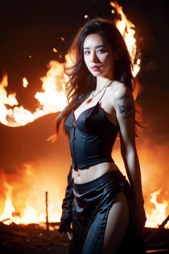 ((((ink)))),((watercolor)),((best quality)),(spirit),((illustration)),(((1 girl))),(beautiful detailed eyes),world masterpiece theater,depth of field,(Burning forest),spark,anime face,Black gauze skirt,(red_hair),blue_eyes,focus_on_face,medium_breasts,(((((messy_long_hair))))),Bare shoulder,very_close_to_viewers,veil,light_leaks,Burning sky,navel,((bustier)),flame,Red Gem Necklace,Rainbow in the sky,Flames burning around,A burning church,(((Fire butterflys ))),(Flying sparks),dragon,burning,fire,jandf,<lora:Flame Dragons:0.6>,