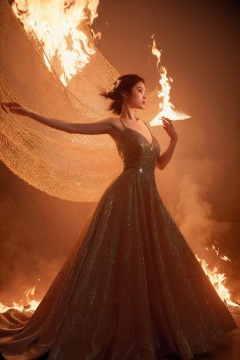 (8k, Best Quality, Masterpiece),Super Detail,(High Detail skin),High fashion photo shoots,long dresses,dynamic poses,<lora:Flame Dragons:1>,jandf,burning,fire,