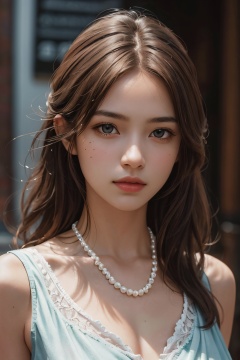 a girl,lateral face,wearing a pearl necklace,brown hair,highest quality,best quality,masterpiece,realistic,masterpiece,realistic,Highly detailed,
