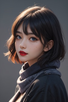 1girl, blue eyes, black hair, realistic, scarf, looking at viewer, solo, lips, long hair, portrait, nose, closed mouth, solo focus, simple background, traditional media, purple scarf, close-up, mole, blue background, bangs, upper body, a parted lips, out of frame, red lips, hair between eyes, pov hands, makeup, brown hair, grey background, eye focus, lipstick, smile, expressionless, parted bangs, mole under mouth, poking, blurry, red scarf, looking over breasts, blue hair, reflection, two side up, mole under eye, short hair,biting, ribbon, painterly,realistic, intense contrast of light and shadow
