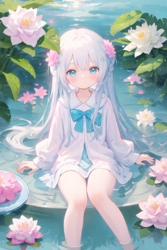 loli, petite, long hair, floating hair, messy hair, 1girl, white hair, white jacket, afloat, air bubble, bathtub, beach, berry, blue eyes, blue flower, bouquet, bow, braid, bubble, camellia, caustics, clover, coral, daisy, floral background, flower, food, fruit, hibiscus, horizon, hydrangea, in water, leaf, lily \(flower\), lily of the valley, lily pad, long sleeves, looking at viewer, lotus, ocean, partially submerged, petals on liquid, pink flower, purple flower, rain, red flower, ripples, rose, sailor collar, shallow water, snowflakes, soaking feet, solo, submerged, waves, white rose, yellow flower,,,,,, mz-hd, backlight