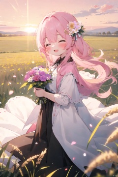 (drawn by Lynn Okamoto),center frame, sharp focus, (panorama, wide shot), best quality, masterpiece, extremely detailed, detailed background, (from above:1.2), 1girl, solo, pink hair, closed eyes, smile, open mouth, skirt, long hair, wavy hair, on side, fluffy hair, , french , blush, smile, capelet, lace trim, bodice, sunset, long dress, dusk, scenery, gold sky, high place, horizon, wheat field, wheat ears, wind, wind blow, looking at viewer, (depth of field), bokeh, (holding a flower:1.3), (holding:1.2),(medium):0.5,