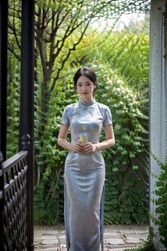 1girl,outdoor,looking_at_viewer,side_blunt_bangs,china_dress,chinese_style,big breasts,pose,solo,1girl,black hair,black eyes,  cheongsam, good hand