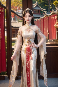 CAFC,1girl,solo,long hair,clothes,earrings,jewelry,hair accessories,full body,suburban scenery,east asian,chinese style architecture,