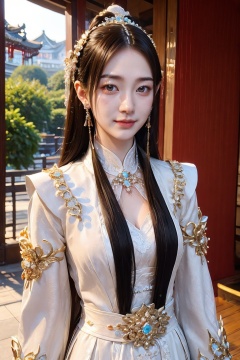 CAFC,1girl,solo,long hair,white clothes,earrings,jewelry,hair accessories,upper body,suburban scenery,east asian,chinese style architecture,