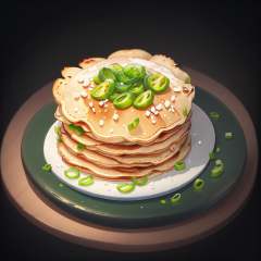 food, game icon institute, game icon,black background,simple background,plate,<lora:icon food-000038jiu:0.6>,jianbing pancake,green onions,