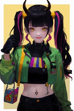 1girl, solo, long hair, looking at viewer, smile, bangs, black hair, hair ornament, gloves, long sleeves, navel, twintails, jewelry, jacket, yellow eyes, multicolored hair, earrings, horns, black gloves, midriff, blunt bangs, bag, open jacket, crop top, black shirt, piercing, ear piercing, zipper, cropped jacket, green jacket,kp
