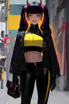 1girl, solo, long hair, looking at viewer, smile, bangs, black hair, hair ornament, gloves, long sleeves, navel, twintails, jewelry, jacket, yellow eyes, multicolored hair, earrings, horns, black gloves, midriff, blunt bangs, bag, open jacket, crop top, black shirt, piercing, ear piercing, zipper, cropped jacket, green jacket,kp