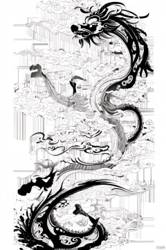 gold chinese dragon, ink mountain, monochrome grayscale, horns, claws, no humans, fire, clouds, oriental dragon