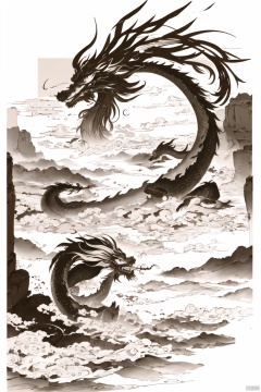 Ink and wash, Paws, Mountains, Dragon Girl, Monochrome, Chinese Dragon