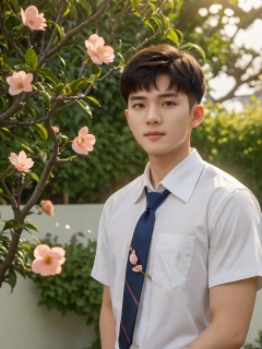 masterpiece,1 boy,Young,Lovely,Handsome,Look at me,Short hair,Tea hair,Students,School uniform,White shirt,Tie,Outdoor,Garden,Peach tree,Flying petals,Light and shadow,HDR,Close-up,textured skin,super detail,best quality,solo,,