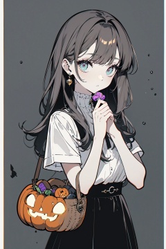 {{(masterpiece:1.2), (best quality:1.2)}},(official art,unity 8k wallpaper,ultra detailed,High quality,best quality),((super-detail)),1girl,sharp focus,1 girl,(jack-o-lantern),(girl is holding a basket in her left hand which has a lot of candy in it),black skirt,pumpkin,candle,bandage,halloween,(expressionless eyes:1.3),cold light,limited palette,low contrast,demon girl,<lora:幻彩流光:1>,
