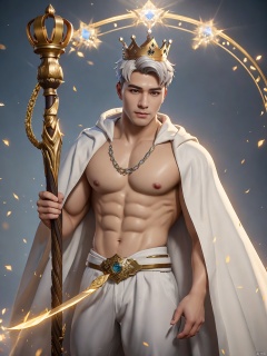 masterpiece,Fortnite,1 boy,Look at me,Handsome,White hair,Muscular development,A gorgeous white cloak,Stand,Hold the scepter in hand,A huge diamond,Wear a crown,Use dark magic.,There's a giant magic circle behind it.,Parting art,UHD,super detail,best quality,