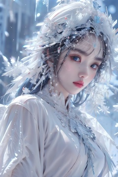 (ice), ((best quality)), ((masterpiece)), ((ultra-detailed)), extremely detailed CG, (illustration), ((detailed light)), (an extremely delicate and beautiful), a girl, solo, ((upper body,)), ((cute face)), expressionless, (beautiful detailed eyes), full breasts, (medium breasts:1.2), blue dragon eyes, (Vertical pupil:1.2), white hair, shiny hair, colored inner hair, [Armor_dress], blue_hair ornament, ice adorns hair,depth of field, [ice crystal], (snowflake), (\shuang hua\)