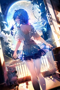 (best quality), (masterpiece), sense of space,backlighting,depth of field,1girl, dark blue hair, long hair, straight hair, moon cat, moon hair ornament, pink clothes, mature, beautiful, white pantyhose,