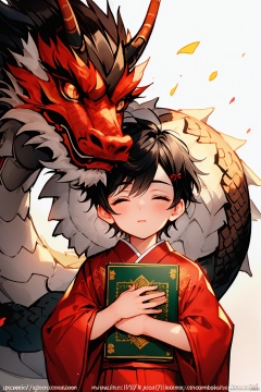 1boy, black hair, hair ornament, long sleeves, closed mouth, closed eyes, upper body, lips, book, hug, watermark, sleeping, web address, realistic, nose, dragon, red kimono, eastern dragon
