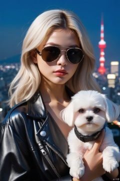 A girl with a maltese puppy behind, cyberpunk, (aviator sunglasses), high-tech clothing, dynamic pose, looking at the viewer, from below, best shadows, complex, depth of field, long hair, messy hair, Tokyo city background, city at night,