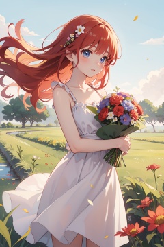upper body, Create an image of an anime girl with bright red hair, wearing a sundress and holding a bouquet of wildflowers, standing in a field of tall grass with a soft breeze blowing through. The scene should capture the whimsical and carefree style of Sakimichan, with a sense of peace and tranquility in the air.