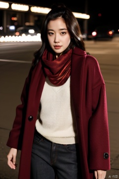PHOTOREALISTIC REALISTIC, masterpiece, best quality, highres, ultra detailed, 8k,flash photography,1woman,cowboy shot,coat,scarf,pants,outdoors,aoiyu,