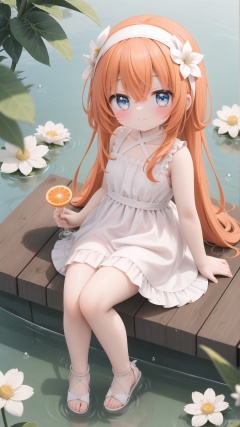 1girl, solo, long hair, looking at viewer, blush, smile, bangs, blue eyes, hair ornament, dress, holding, hair between eyes, bare shoulders, jewelry, sitting, very long hair, closed mouth, full body, flower, hairband, food, sleeveless, white dress, orange hair, cup, bare arms, fruit, sleeveless dress, sandals, white flower, bubble, minigirl, white hairband, in container, orange \(fruit\), submerged, orange slice