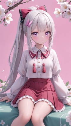 masterpiece,best quality,absurdres:1.1), 1girl,beautiful detailed girl,fine and beautiful detailed skin,(tassel hair ornament:1.3),solo,blunt bangs,blunt tresses,ponytail,hair bow,hair ribbon,red ribbon,long hair,smile,legs up,sitting in tree,flower necklace,vines,frilled skirt, (extremely detailed beautiful background:1.1),(floral background:1.3),flower,bloom,The tree is in full bloom with flowers,glowing butterfly,butterfly,Flowers all over the ground,(Flowers blooming all over the branches,:1.1), ray tracing,reflection light,water drop,(beautiful detailed eyeliner),(beautiful detailed skin),(smooth skin),(shiny skin:0.8),(shiny:0.8),wide shot,depth of field,rainbow,