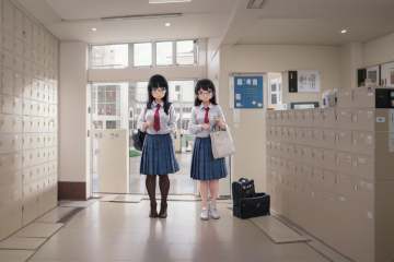 best quality, ultra-detailed, illustration,getabako, scenery, window, indoors, building, door, tree, day, multiple girls, glasses, black hair, long hair, standing, red necktie, pantyhose, white shirt, shoes, school uniform, blue skirt, collared shirt, <lora:getabako2_SD15_V1_DIM4:1>