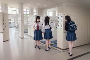 best quality, ultra-detailed, illustration,multiple girls, glasses, black hair, long hair, standing, red necktie, pantyhose, white shirt, shoes, school uniform, blue skirt, collared shirt,getabako, scenery, window, building, door <lora:getabako2_SD15_V1:1>
